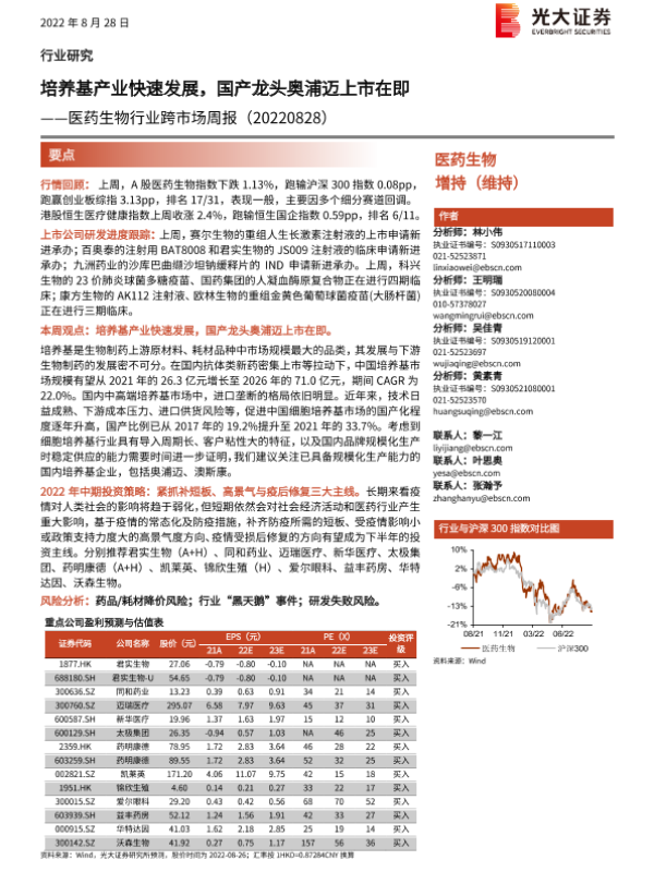 【光大证券】【20220828】医药生物行业跨市场周报:培养基产业快速发展,国产龙头奥浦迈上市在即-28页 行业研究