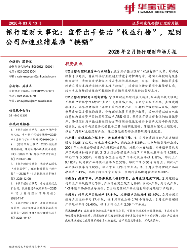 【华宝证券】【202603】2026年2月银行业理财市场月报:银行理财大事记,监管出手整治“收益打榜”,理财公司加速业绩基准“换锚”-13页 证券期货研究报告