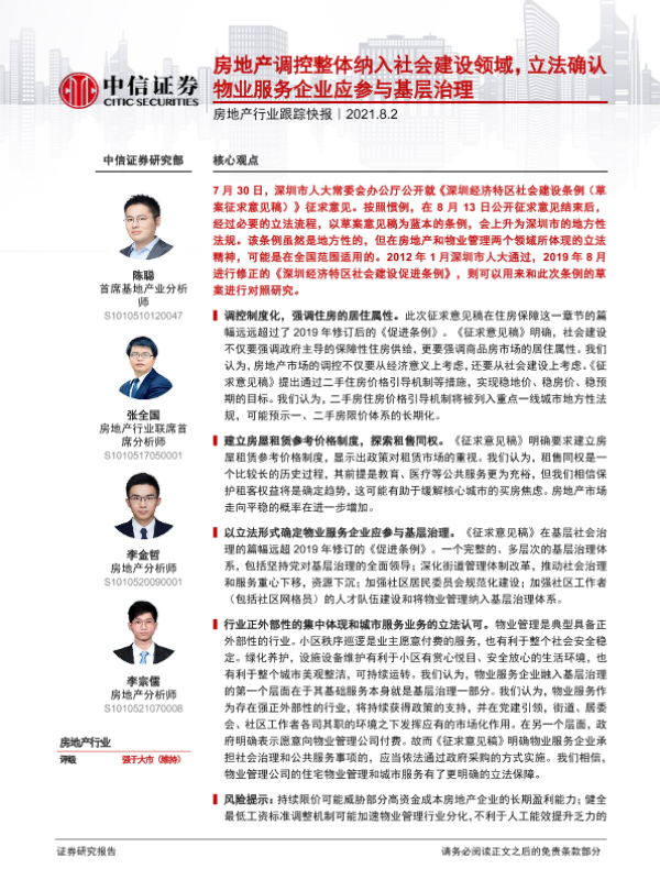 【中信证券】【20210802】房地产行业跟踪快报:房地产调控整体纳入社会建设领域,立法确认物业服务企业应参与基层治理-3页 行业研究