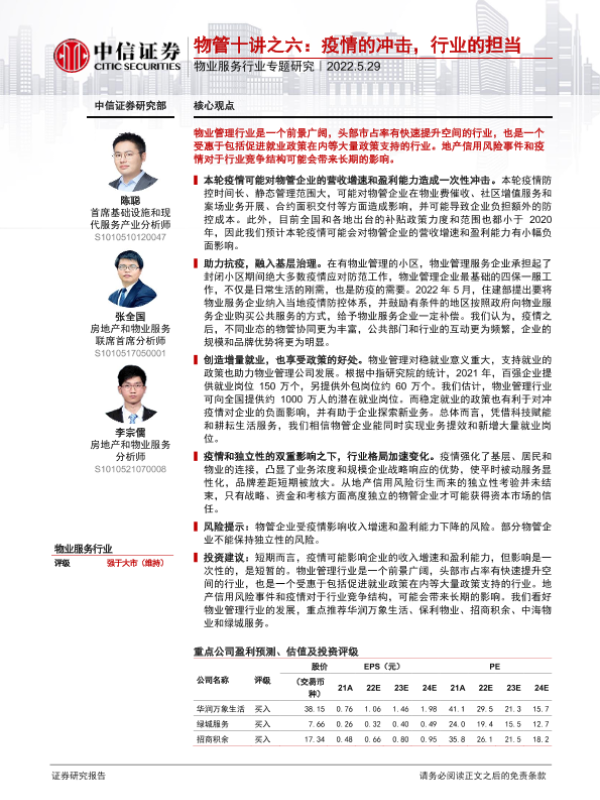 【中信证券】【20220529】物业服务行业专题研究:物管十讲之六,疫情的冲击,行业的担当-18页 行业研究