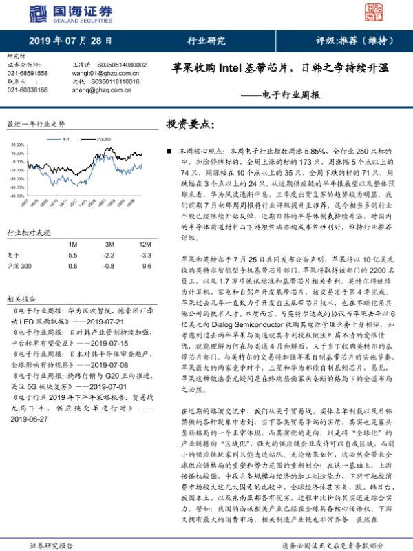【国海证券】【20190728】20190728-国海证券-电子行业周报:苹果收购Intel基带芯片,日韩之争持续升温-13页 行业研究