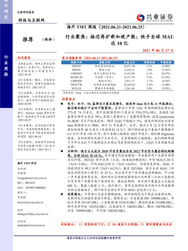 【兴业证券】【20210627】行业聚焦:格芯再扩新加坡产能;快手全球MAU达10亿-20页 行业研究