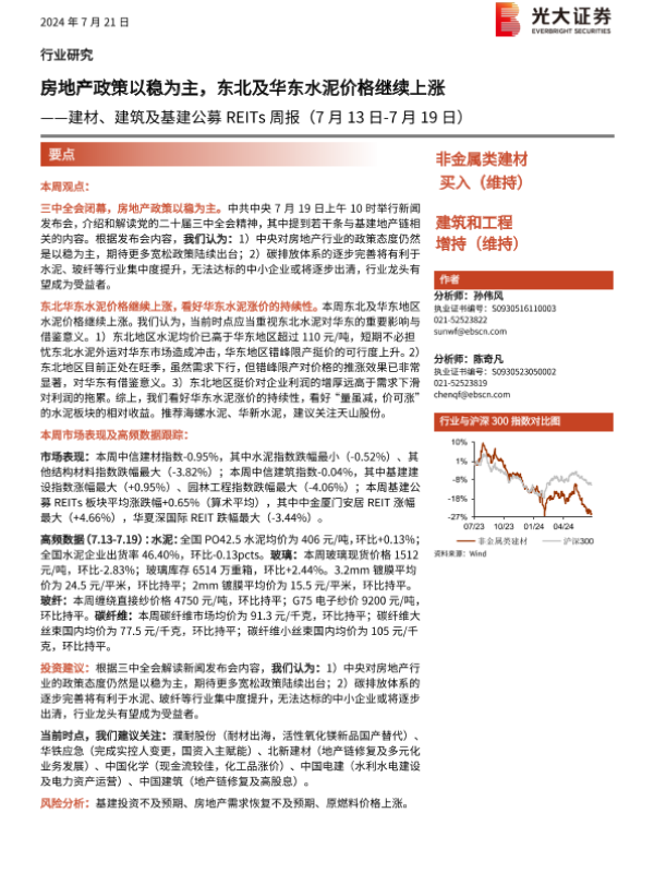 【光大证券】【20240721】建材、建筑及基建公募REITs周报:房地产政策以稳为主,东北及华东水泥价格继续上涨-18页 行业研究