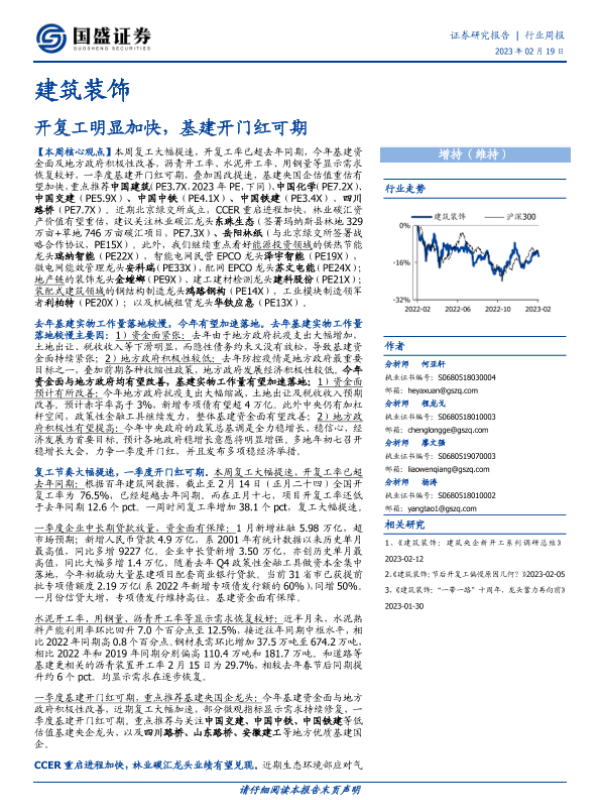 【国盛证券】【20230219】建筑装饰行业周报:开复工明显加快,基建开门红可期-12页 行业研究