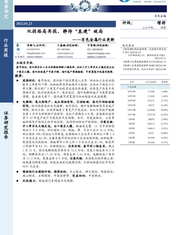 【国泰君安证券】【20220123】20220123-国泰君安-有色金属行业更新:双弱格局再现,静待“基建”破局-8页 行业研究