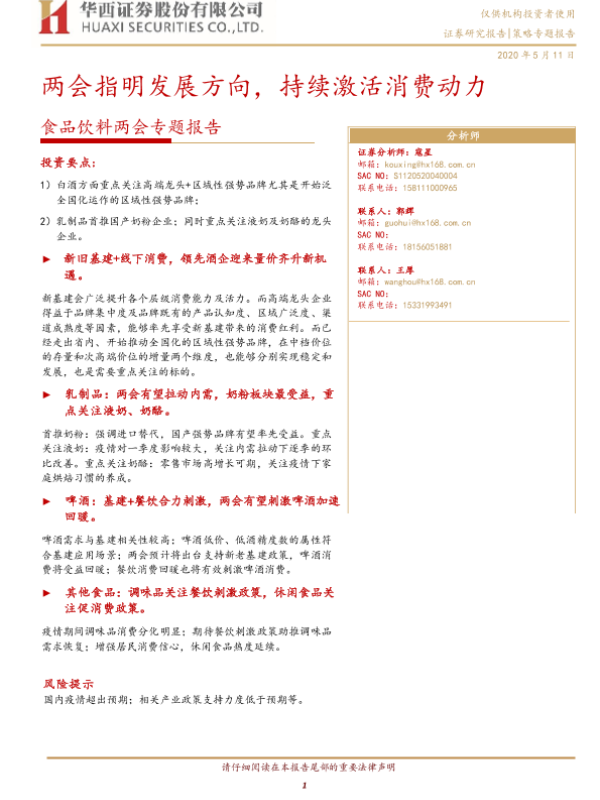 【华西证券】【20200511】20200511-华西证券-食品饮料两会专题报告:两会指明发展方向,持续激活消费动力-8页 行业研究
