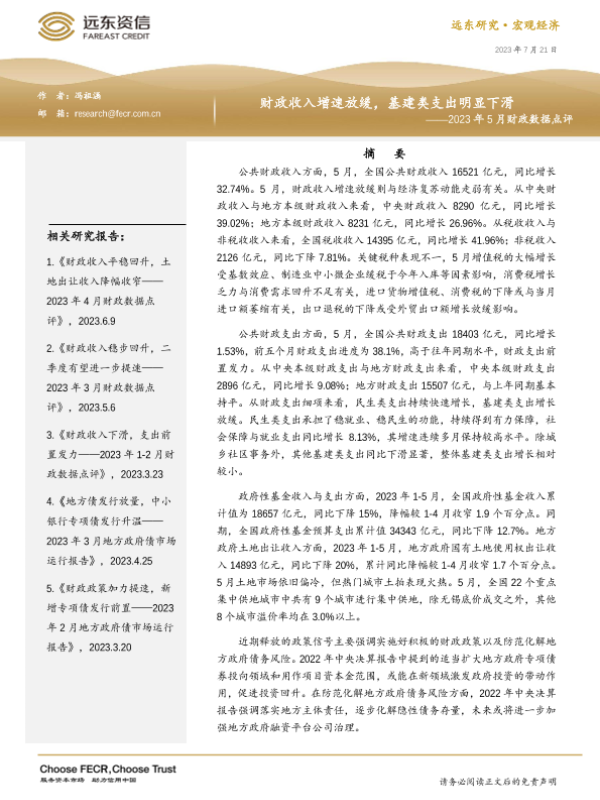 【远东资信】【20230721】财政收入增速放缓,基建类支出明显下滑——2023年5月财政数据点评-12页 行业研究