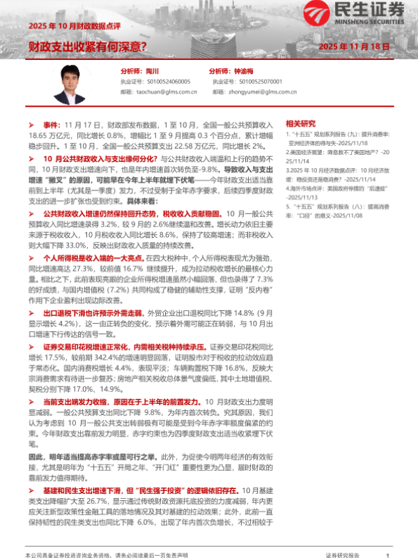 【民生证券】【202511】2025年10月财政数据点评:财政支出收紧有何深意?-5页 证券期货研究报告