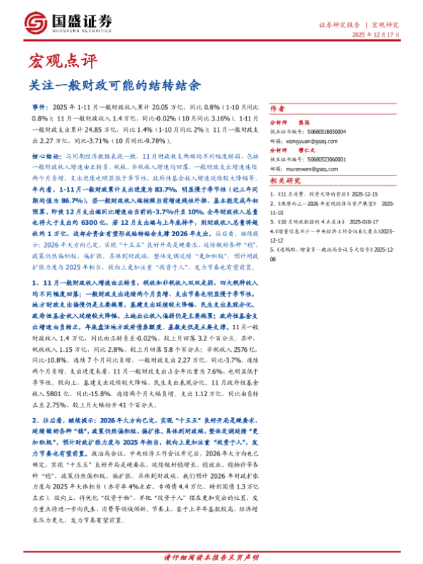 【国盛证券】【202512】宏观点评_关注一般财政可能的结转结余-4页 证券期货研究报告