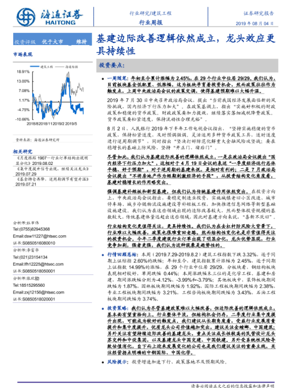 【海通证券】【20190804】建筑工程行业周报:基建边际改善逻辑依然成立,龙头效应更具持续性-8页 行业研究
