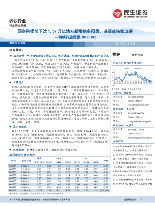 【民生证券】【20190102】国务院提前下达1.39万亿地方新增债务限额,基建或持续改善——钢铁行业周报 20190102-22页 行业研究
