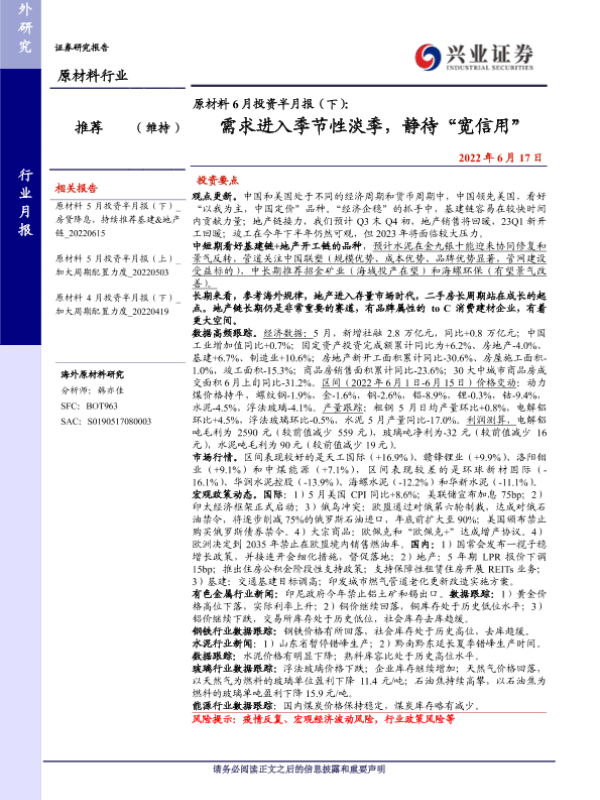 【兴业证券】【20220617】原材料6月投资半月报(下):需求进入季节性淡季,静待“宽信用”-29页 行业研究