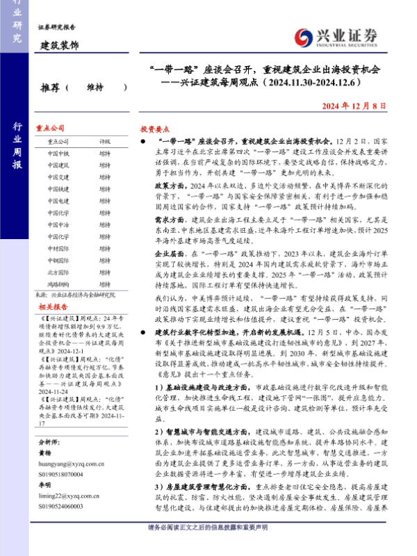 【兴业证券】【20241208】‘一带一路’座谈会召开,重视建筑企业出海投资机会-15页 行业研究