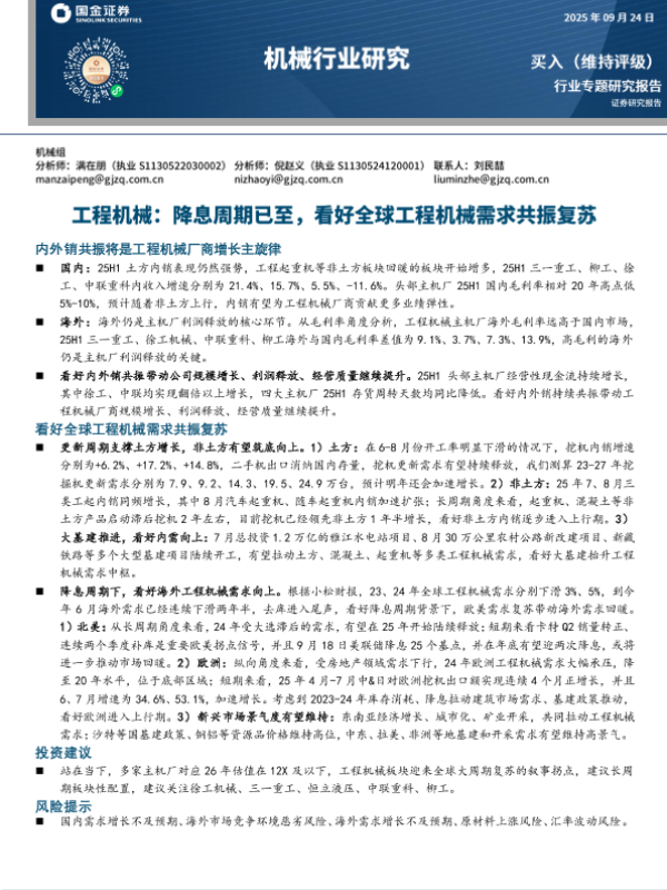 【国金证券】【202509】工程机械 降息周期已至,看好全球工程机械需求共振复苏-21页 证券期货研究报告