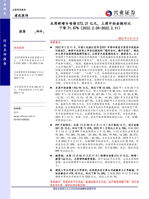 【兴业证券】【20220213】本周新增专项债572.21亿元,上周中标金额环比下降71.87%-27页 行业研究
