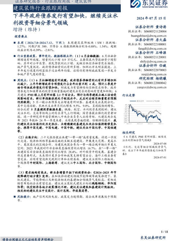 【东吴证券】【20240715】建筑装饰行业跟踪周报:下半年政府债券发行有望加快,继续关注水利投资等细分景气领域-11页 行业研究