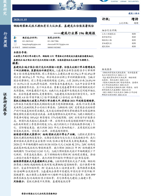 【国泰君安证券】【20201115】钢结构装配式技术授权有巨大认知差,基建龙头估值显著低估-6页 行业研究