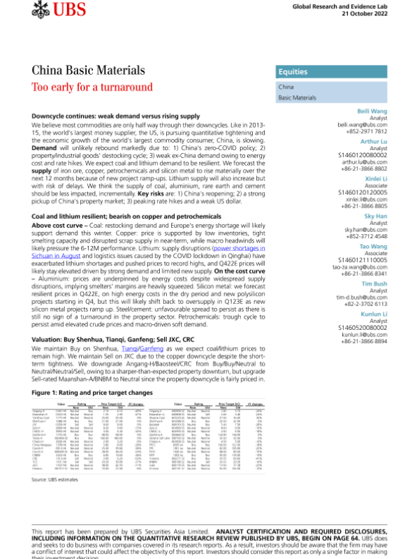 【UBS Securities Asia Limited】【20221021】China Basic Materials Too early for a turnaround-72页 行业研究