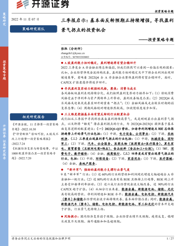 【开源证券】【20221107】三季报启示:基本面反转预期正持续增强,寻找盈利景气拐点的投资机会-27页 行业研究
