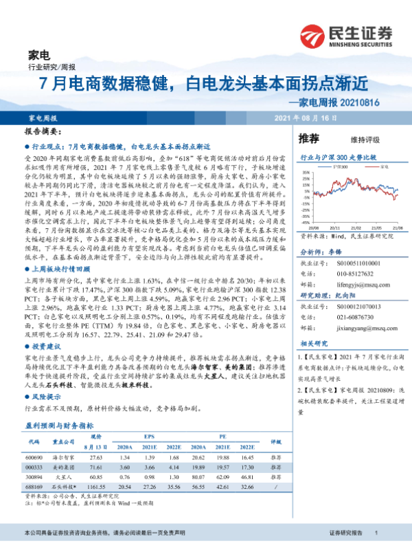 【民生证券】【20210816】20210816-民生证券-家电周报:7月电商数据稳健,白电龙头基本面拐点渐近-18页 行业研究