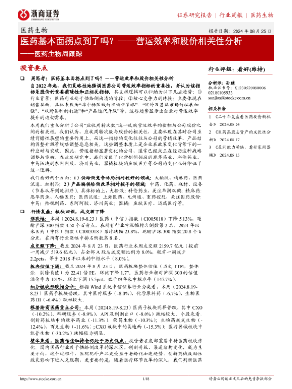 【浙商证券】【20240825】医药生物周跟踪:营运效率和股价相关性分析-18页 行业研究