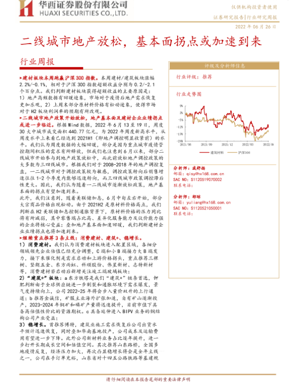 【华西证券】【20220626】建筑材料行业周报:二线城市地产放松,基本面拐点或加速到来-18页 行业研究