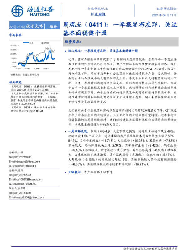 【海通证券】【20210411】20210411-海通证券-农业周观点:一季报发布在即,关注基本面稳健个股-4页 行业研究