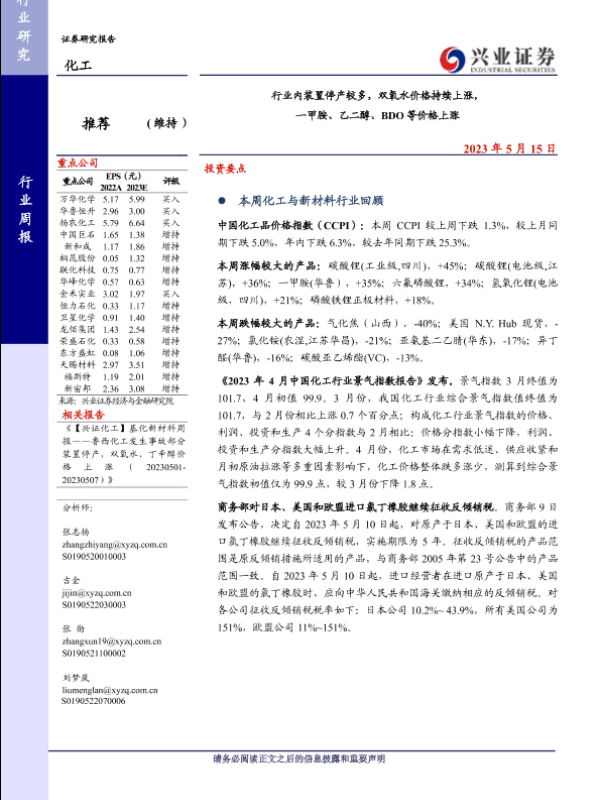 【兴业证券】【20230515】行业内装置停产较多,双氧水价格持续上涨,一甲胺、乙二醇、BDO等价格上涨-46页 行业研究