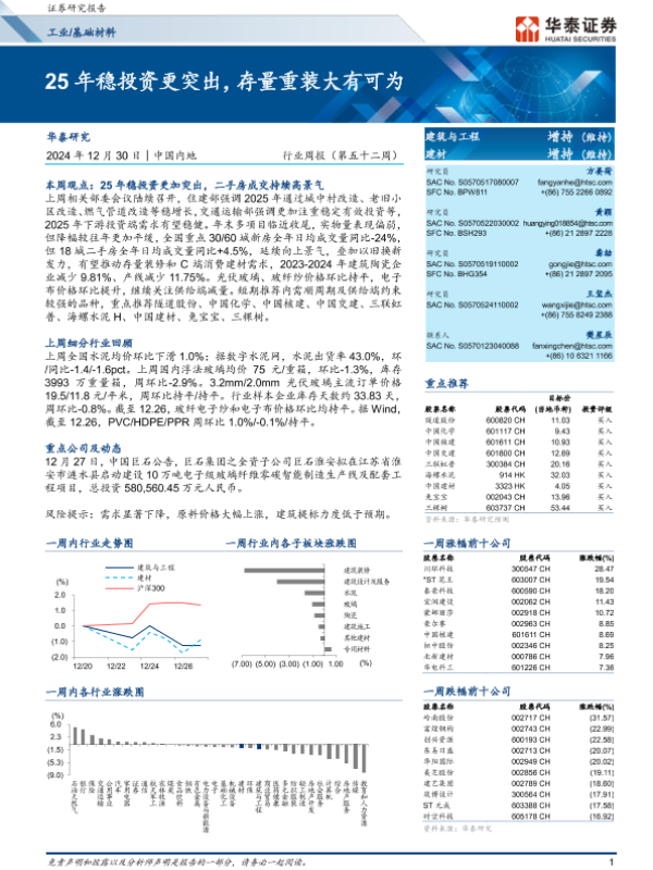 【华泰证券】【20241230】工业基础材料行业周报:25年稳投资更突出,存量重装大有可为-14页 行业研究