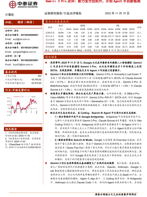 【中泰证券】【202511】计算机行业Gemini 3 Pro点评:能力全方位跃升,开创Agent平台新格局.pdf-3页 证券期货研究报告