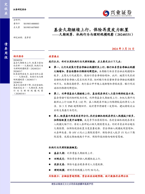 【兴业证券】【20240331】久期测算、机构行为与理财规模观察:基金久期继续上行,保险再度发力配置-13页 行业研究