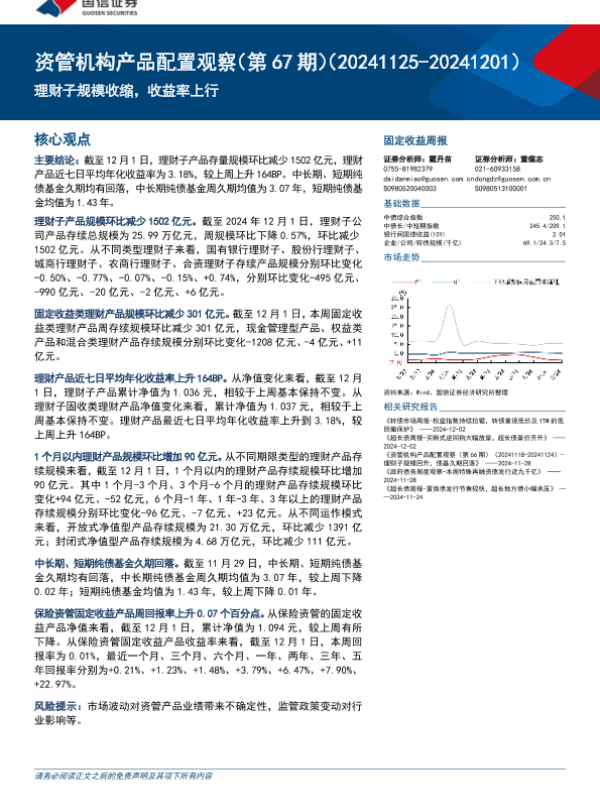 【国信证券】【20241204】资管机构产品配置观察(第67期):理财子规模收缩,收益率上行-15页 行业研究