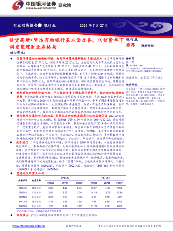 【银河证券】【20210727】银行行业动态报告:信贷高增+降准有助银行基本面改善,代销费率下调重塑理财业务格局-23页 行业研究