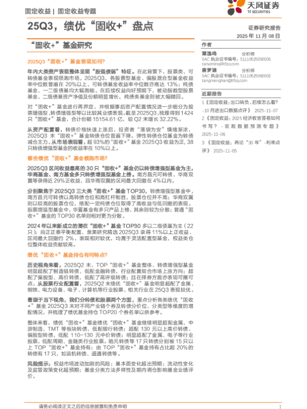 【天风证券】【202511】“固收+”基金研究:25Q3,绩优“固收+”盘点-251108-天风证券-24页.pdf-24页 证券期货研究报告