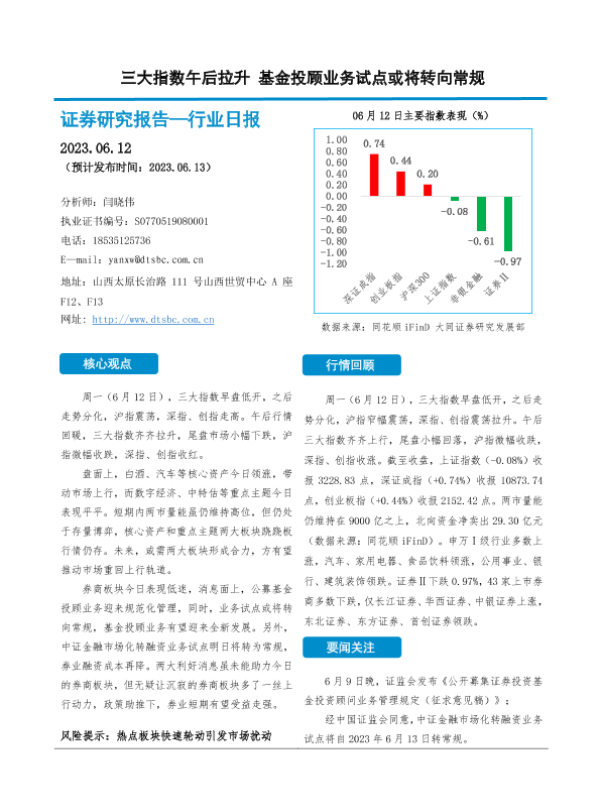 【大同证券】【20230612】非银金融行业日报:三大指数午后拉升 基金投顾业务试点或将转向常规-10页 行业研究
