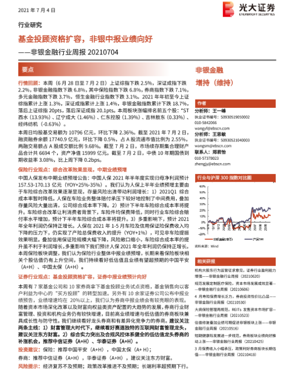 【光大证券】【20210704】非银金融行业周报:基金投顾资格扩容,非银中报业绩向好-10页 行业研究