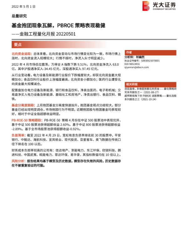 【光大证券】【20220501】金融工程量化月报:基金抱团现象瓦解,PBROE策略表现稳健-15页 行业研究