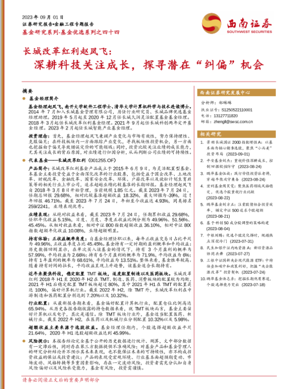 【西南证券】【20230901】长城改革红利赵凤飞:深耕科技关注成长,探寻潜在“纠偏”机会-20页 行业研究
