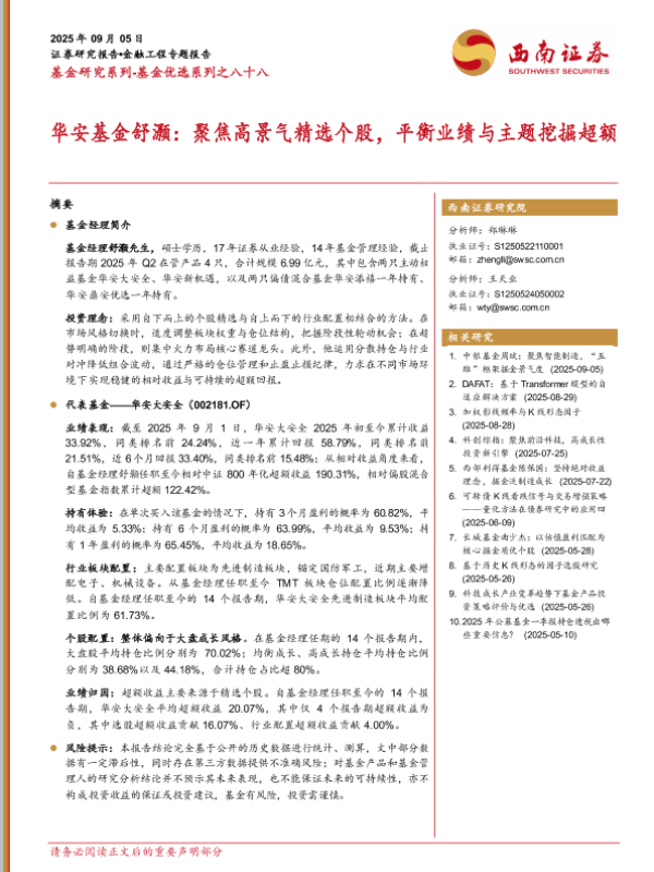 【西南证券】【202509】华安基金舒灏:聚焦高景气精选个股,平衡业绩与主题挖掘超额-23页 证券期货研究报告