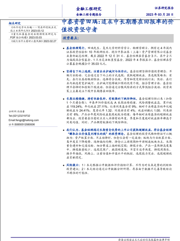 【海通证券】【20230320】中泰资管田瑀:追求中长期潜在回报率的价值投资坚守者-19页 行业研究