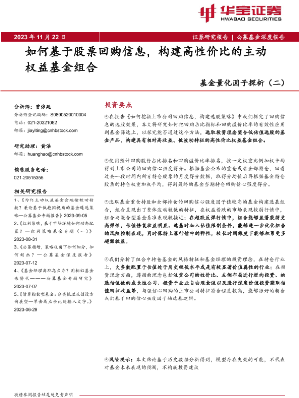 【华宝证券】【20231122】基金量化因子探析(二):如何基于股票回购信息,构建高性价比的主动权益基金组合-12页 行业研究