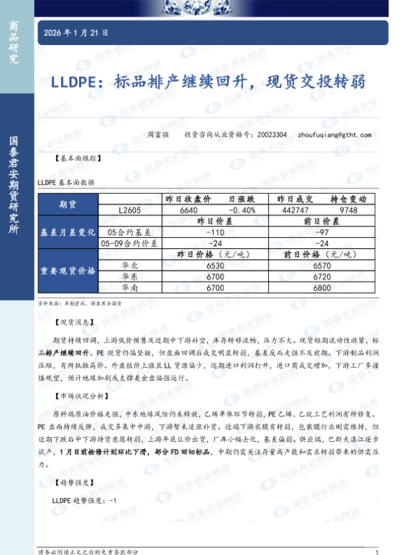 【国泰君安期货】【202601】LLDPE:标品排产继续回升,现货交投转弱-2页 证券期货研究报告