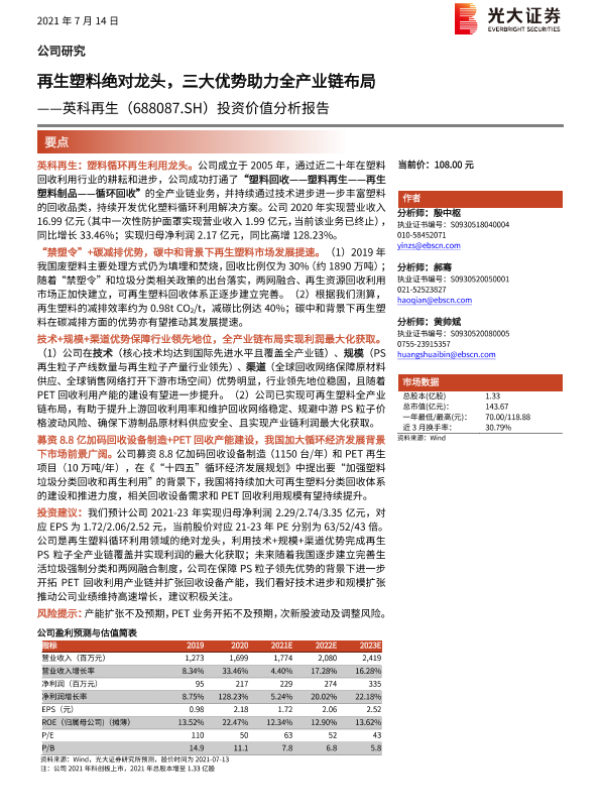 【光大证券】【20210714】英科再生-688087.SH-投资价值分析报告:再生塑料绝对龙头,三大优势助力全产业链布局-31页 行业研究