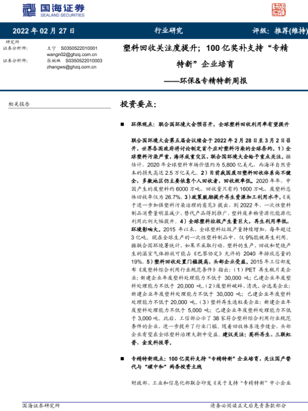 【国海证券】【20220227】塑料回收关注度提升;100亿奖补支持“专精特新”企业培育-18页 行业研究