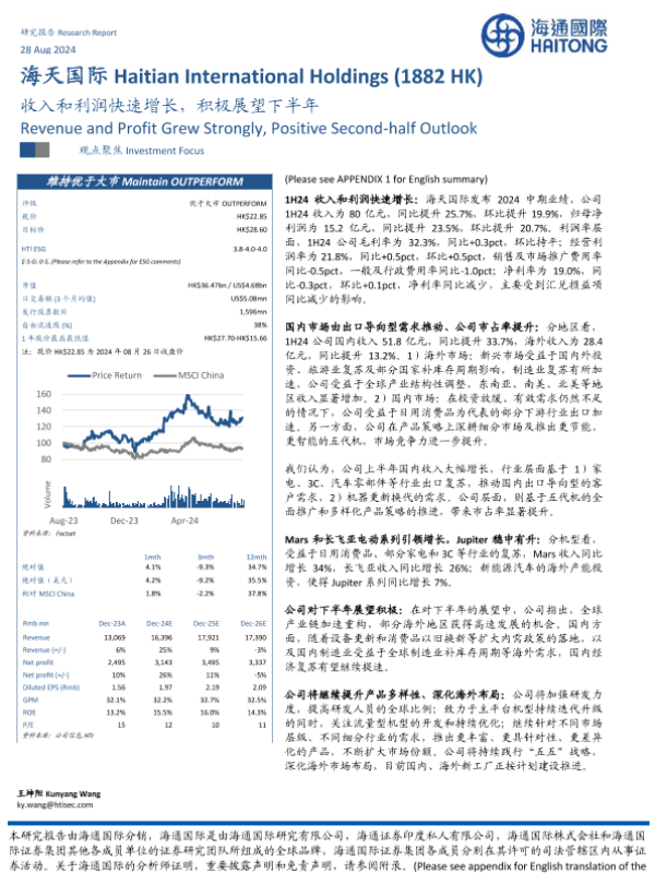 【海通国际】【20240828】海天国际(1882.HK)收入和利润快速增长,积极展望下半年-12页 行业研究