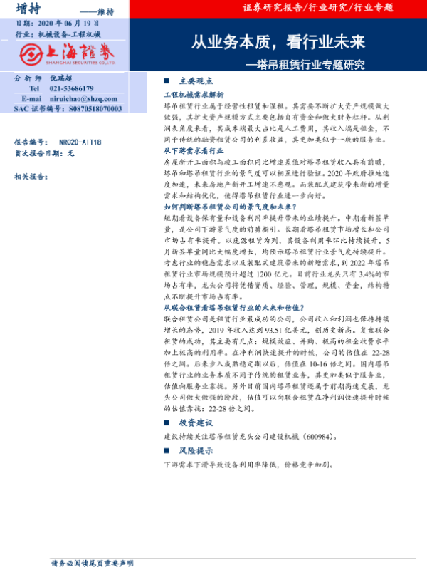 【上海证券】【20200619】20200619-上海证券-塔吊租赁行业专题研究:从业务本质,看行业未来-22页 行业研究