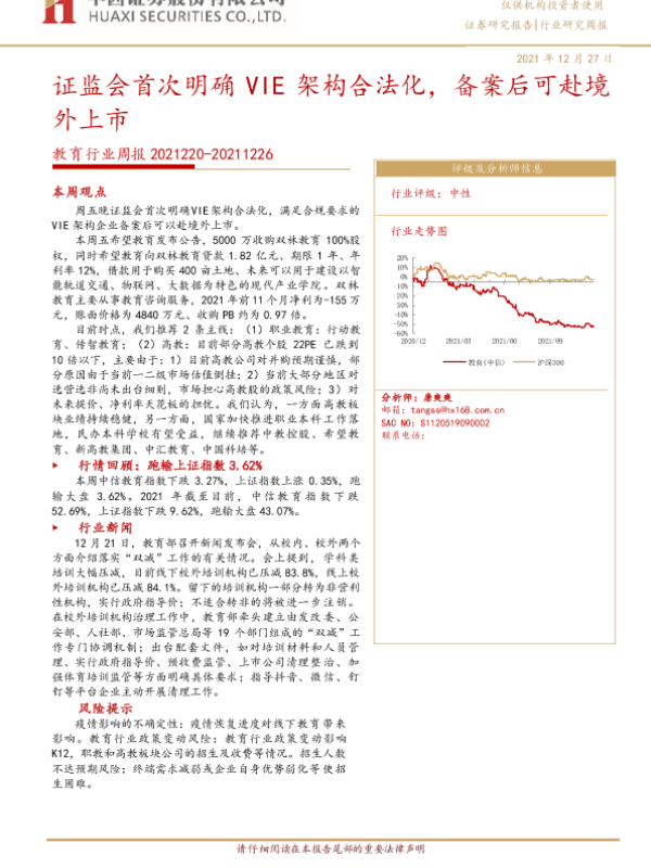 【华西证券】【20211227】教育行业周报:证监会首次明确VIE架构合法化,备案后可赴境外上市-16页 行业研究