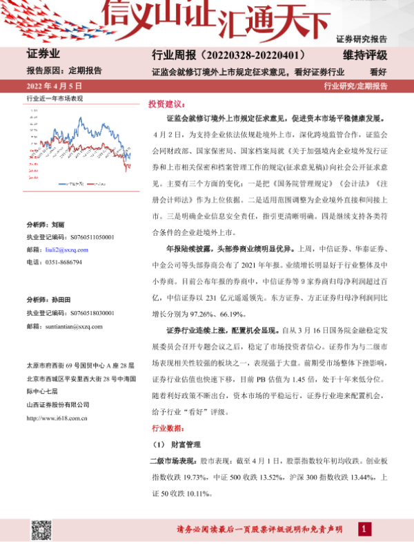 【山西证券】【20220405】证券业行业周报:证监会就修订境外上市规定征求意见,看好证券行业-11页 行业研究