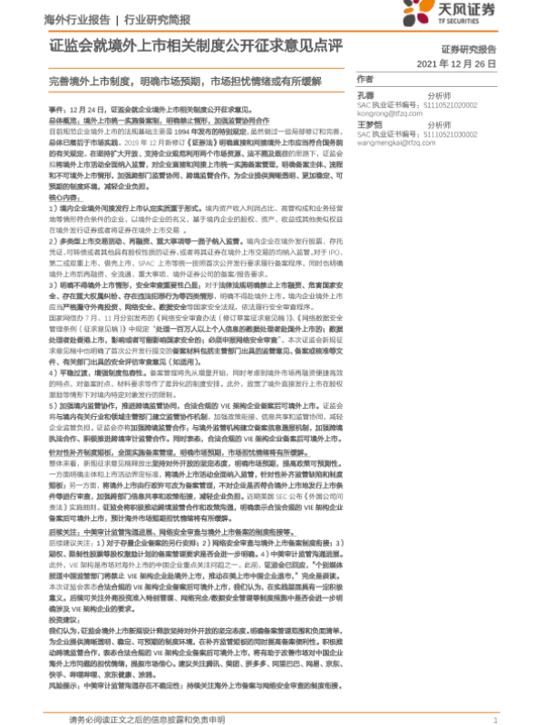 【天风证券】【20211226】证监会就境外上市相关制度公开征求意见点评-2页 行业研究