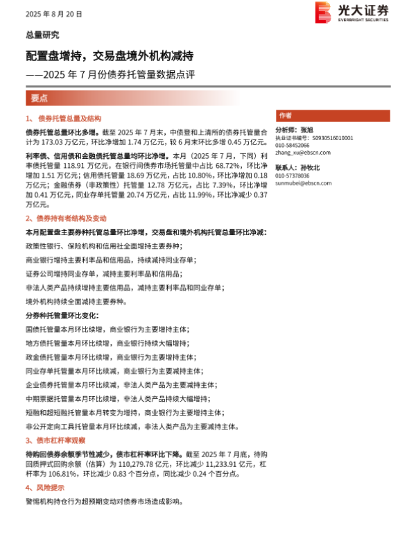 【光大证券】【202508】2025年7月份债券托管量数据点评:配置盘增持,交易盘境外机构减持-11页 证券期货研究报告